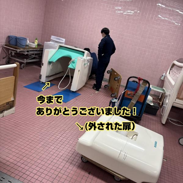 少しくたびれてきたチェアー浴(機械浴)、大阪万博でも展示されていた全自動お風呂ではありませんが、内側のシャワーにはウルトラファインバブルを搭載した最新のチェアー浴(機械浴)に生まれ変わりました!
