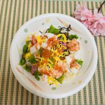 メニューは、華ちらし、ふんわり豆腐の煮物、すまし汁、抹茶水羊羹!